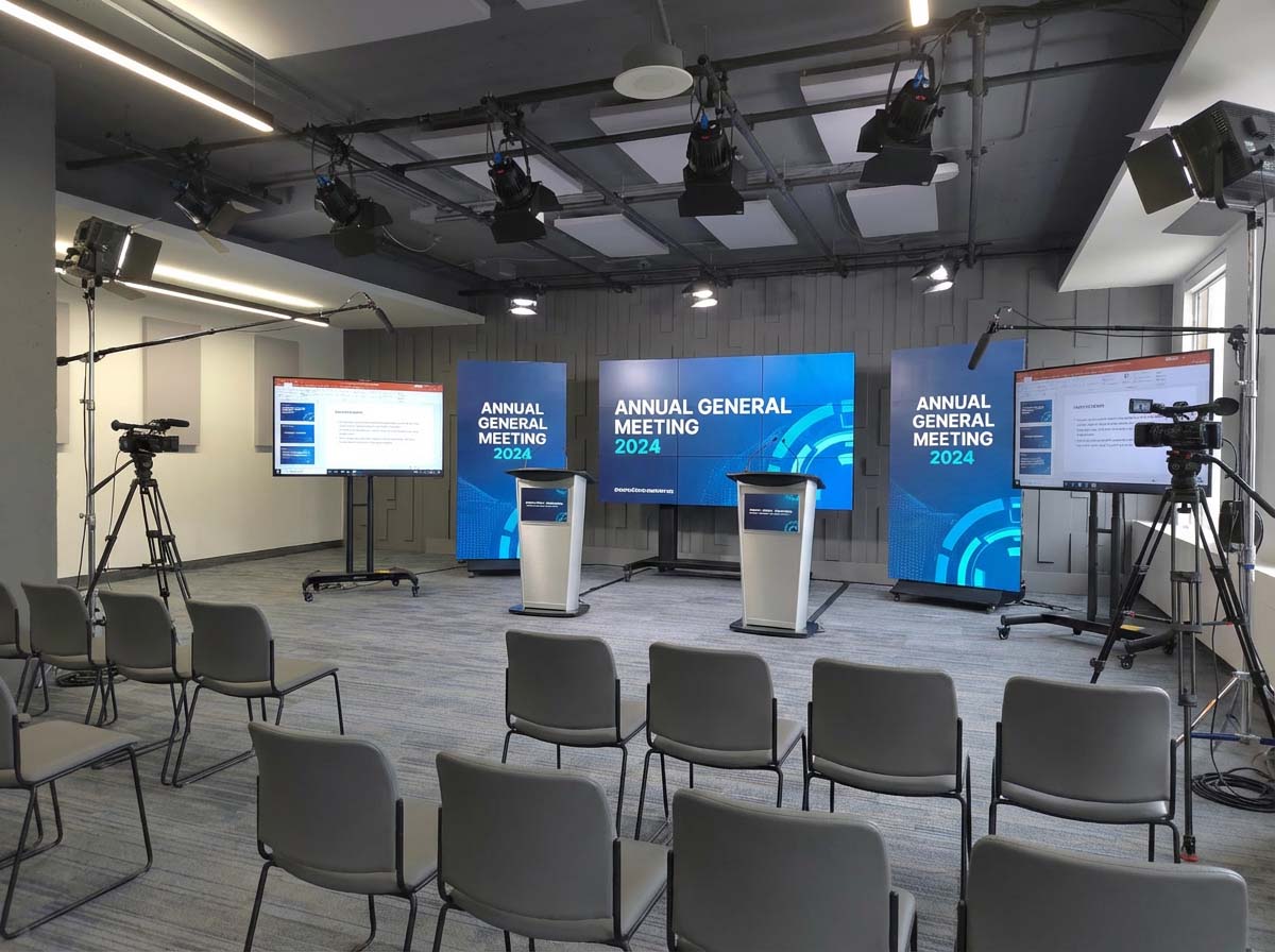Les assemblées générales annuelle hybrides rassemblent les actionnaires sur place et à distance pour les présentations, le vote et les périodes de questions. Notre studio de diffusion et ses espaces adjacents offrent un environnement professionnel entièrement géré, idéal pour les organisations qui tiennent leurs rencontres à Toronto. Grâce à la plateforme de webdiffusion icastPro, chaque actionnaire peut suivre les délibérations, voter en temps réel et participer en toute confiance.