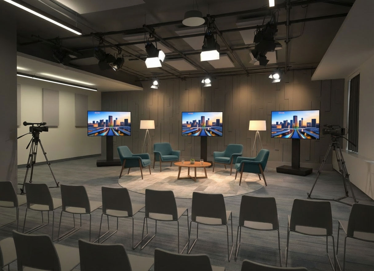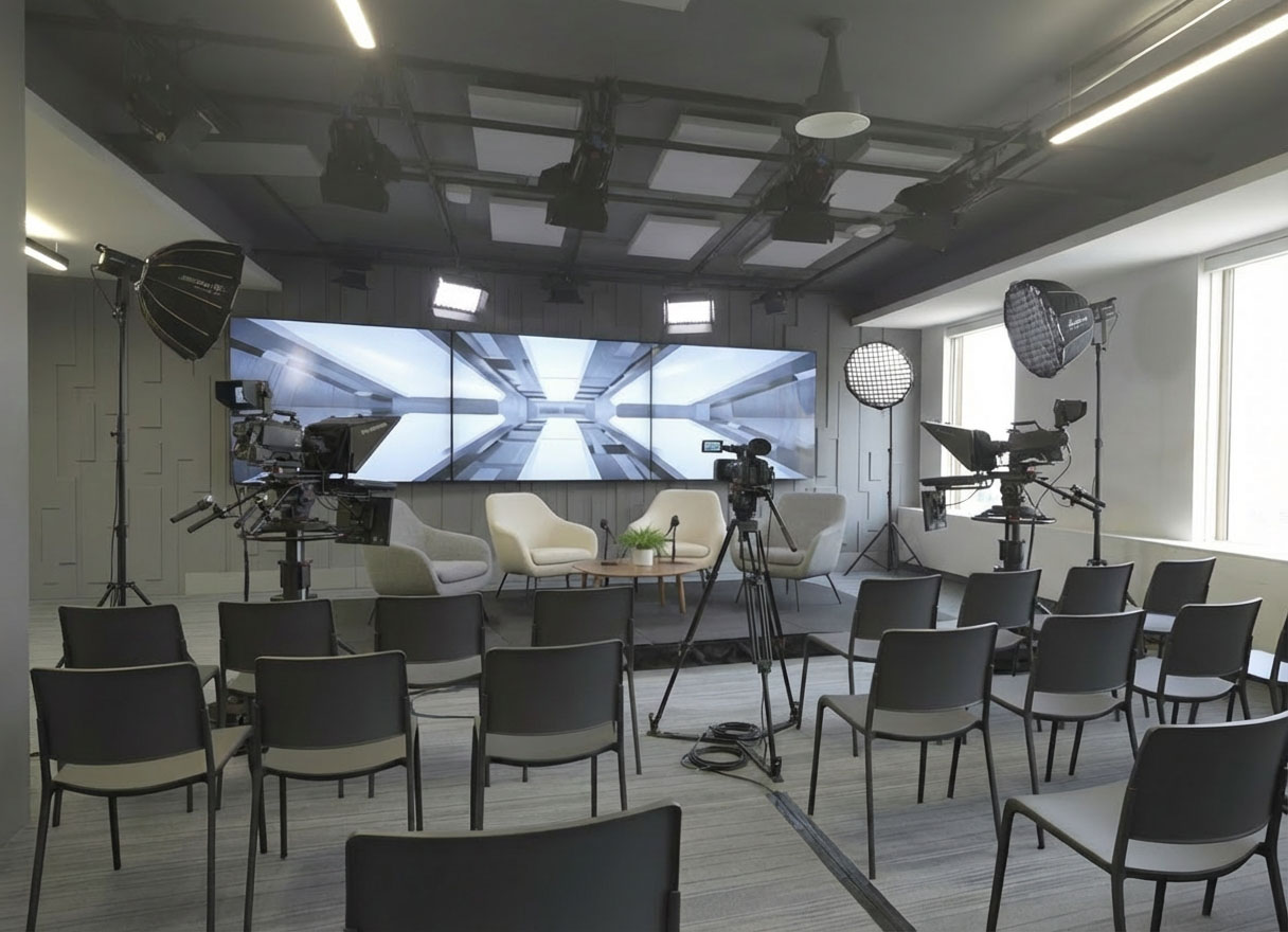 Notre technologie de production offre une qualité de studio de haut niveau pour vos rencontres. La captation multicaméra, l’éclairage professionnel et le son de qualité diffusion sont entièrement gérés depuis une régie dédiée, avec soutien téléprompteur, moniteurs de retour et intégration fluide des intervenants à distance.